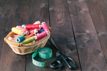 tailor the tool to measure the length, spools of colored thread on a wooden background