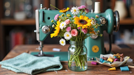 Vintage sewing machine with colorful flowers in jar on wooden table. That the image is generated using AI.