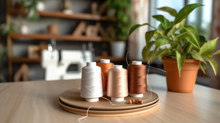 Bright Modern Sewing Workshop with Sewing Machines and Colorful Threads. Concept of Creativity, Fashion Design, Textile Art, and Craftsmanship in a Sunlit Studio.
