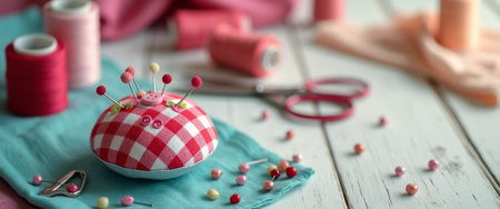 A delightful sewing scene featuring a checkered pin cushion adorned with colorful pins, surrounded by spools of thread in soft pastel hues. This inviting composition captures the essence of creativity and craftsmanship, inspiring a sense of warmth and nostalgia for handmade projects.