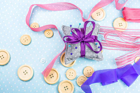 buttons on the table with pins and ribbons, Sewing accessories dressmaker