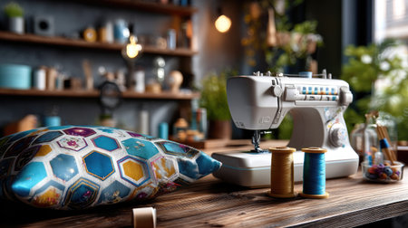 A vibrant sewing machine sits on a rustic wooden table, surrounded by colorful threads, a decorative pillow, and an inviting craft space, inspiring creativity and warmth.