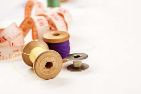 multicolored bobbins thread on the background of accessories for sewing close-up