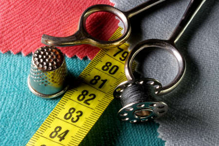 Old retro tailor's tools for sewing clothes. Centimeter, scissors, thimble and needle with snitch.
