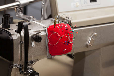Closeup of sewing machine with pin cushion