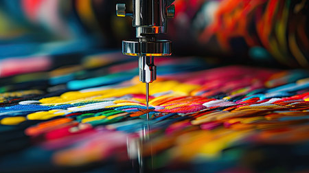 A close-up view of a sewing needle weaving through vibrant fabric, showcasing the intricate details and colorful patterns typical in textile art.