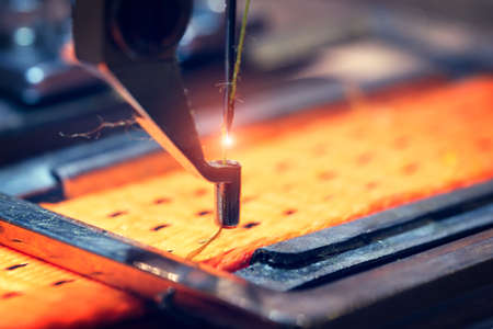Close-up detail of the Full automatic sewing machine. Background of working place