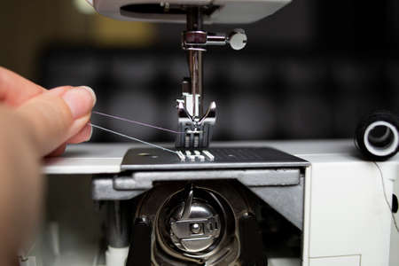 Part of a sewing machine with a needle and a thread pulled into it close-up