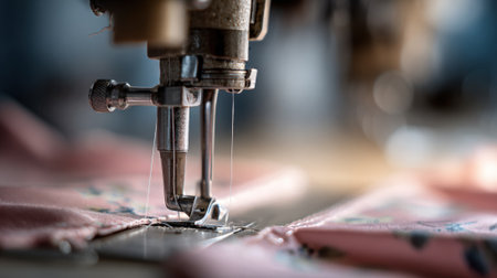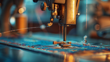 The sewing machine stitches colorful fabric under workshop lighting, highlighting its craftsmanship