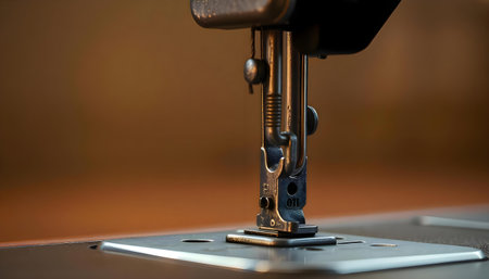 Close-up of sewing machine's presser foot and needle in selective focus.
