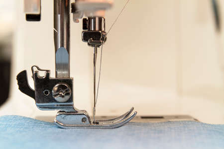 Closeup of sewing machine working part with blue fabric