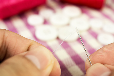 Close-up of a tailor's hands inserting a thread into the eye of a needle. Repair of clothes at home.