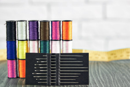 Seamstress set of multiple needles and colorful threads on the wooden table. Embroidery and sewing industry. Copy space for text
