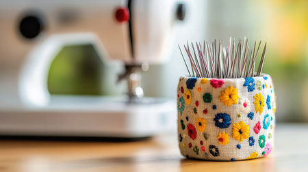 A charming, colorful pincushion filled with sewing pins is prominently placed next to a sleek sewing machine, embodying the essence of creativity and craftsmanship in a bright workspace.