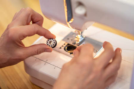 The workplace of a seamstress. The dressmaker works on a sewing machine. A tailor threads a thread into a sewing machine at his workplace. Hobby-sewing as a small business concept. High quality photo