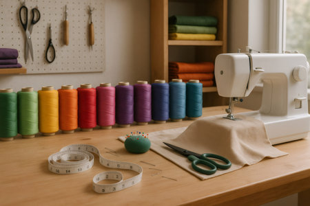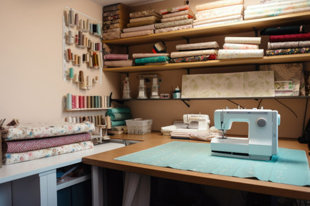 sewing and fabric projects in a studio setting, with sewing machine and tools nearby, created with generative ai