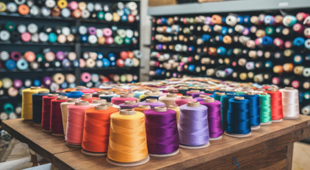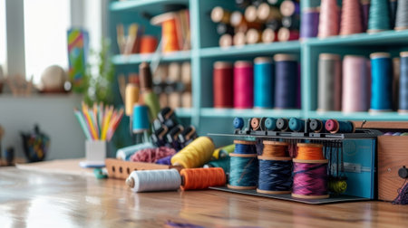 Colorful sewing threads organized on table in a craft room
