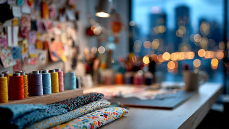 A sewing room with colorful fabrics and threads on a table by a city window at dusk