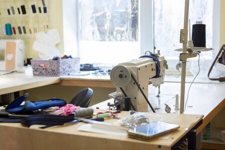 Sewing machine with fabric on table in tailor workshop. Professional sewing machine on the background of atelier studio. Sewing machine, rolls of thread, fabric, scissors. Sewing business concept