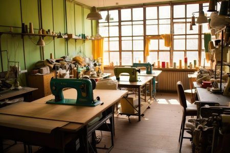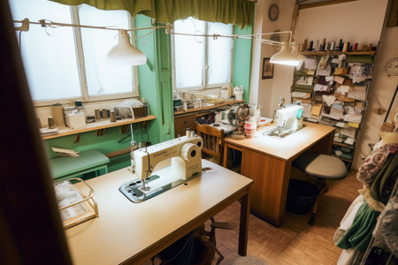 Bustling Sewing Workshop Interior with Colorful Fabrics and Sewing Machines. Concept of Creativity, Craftsmanship, Textile Design, and Artistic Workspace.