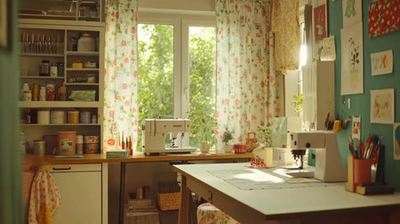 sewing studio with light and airy decor, sewing machine, and basket of fabrics, created with generative ai