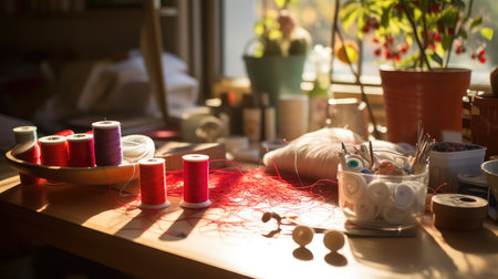 Colorful needlework station with pin cushion and craft supplies in cozy workspace. That the image is generated using AI.