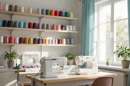 Bright Modern Sewing Workshop with Sewing Machines and Colorful Threads. Concept of Creativity, Fashion Design, Textile Art, and Craftsmanship in a Sunlit Studio.