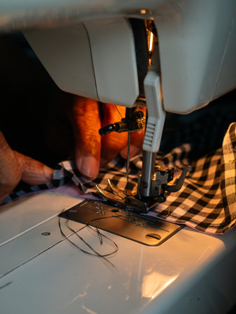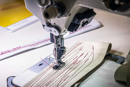 Close up of an industrial sewing machine working in a garment manufacturing factory