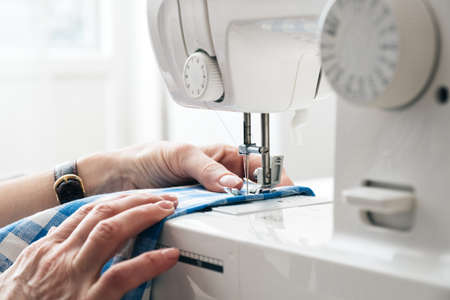 Handmade seamstress. Woman thin fingers hold the braid in a hand sewing machine close-up. Nearby lies a fabric with a blue pattern