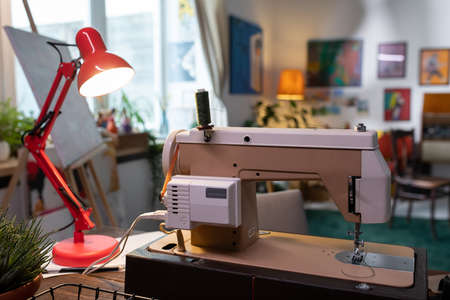 Horizontal no people selective focus shot of sewing machine and lamp on table in living room belonging to fashion designer