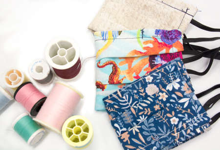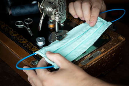Stepwise stitching of blue fabric medical masks. Close-up hands holding a ready-made mask. The concept of medical mask deficiency during the COVID-19 coronavirus pandemic.