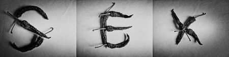 Close-up of the word SEX is spelled out in peppers against a light background.