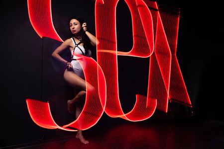 Hot sexy girl neon light dance night club leather harness dressed white night-club Perfect female body with neon lettering on the background Seductive female indoor Sensetive dancer violet lightning