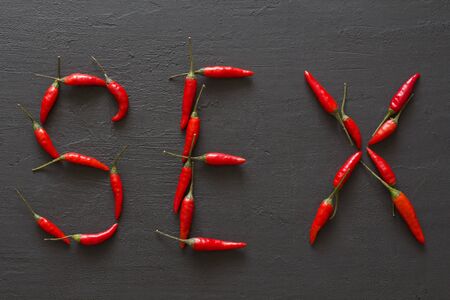 Word Sex Red Hot Chili Peppers On Black Background on Black Table. Swx letter arranged from red chili peppers. Copy space for your text. Flat lay, top view. Words from food and vegetables. Erotica.