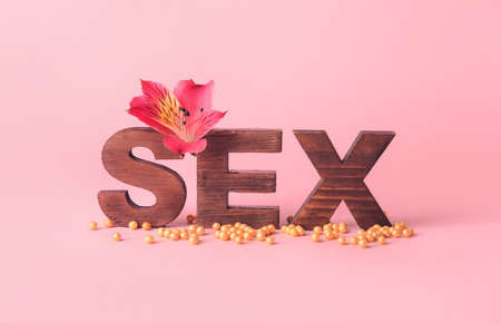 Sex. Health, pleasure and partners concept. Wooden letters and toys for adults