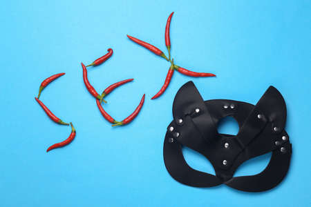 The word sex made from red chili peppers and cat mask on a blue background. Intimate games, love, romantic, erotic concept