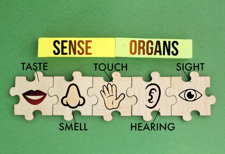 Puzzle with five Sense organs icons namely sight, hearing, smell, teste and touch. basic 5 human senses