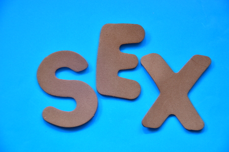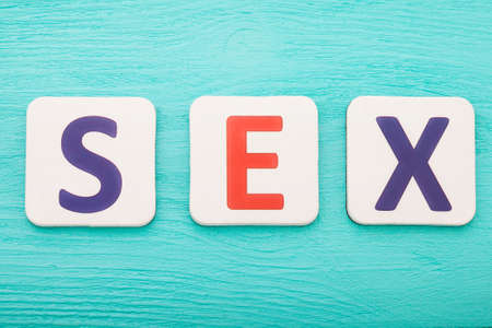 Sex word by letter blocks on blue wooden background. top view. copyspace.