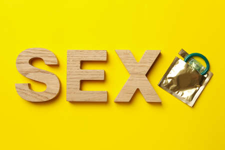 Word Sex made of wooden letters and condom on yellow background