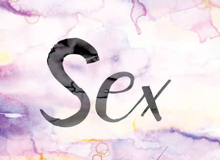 The word Sex painted in black ink over a colorful watercolor washed background concept and theme.