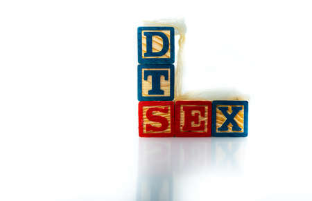 Wooden alphabet toy blocks spell the words STD and SEX. A used condom sits on the blocks, isolated on white background. High quality photo