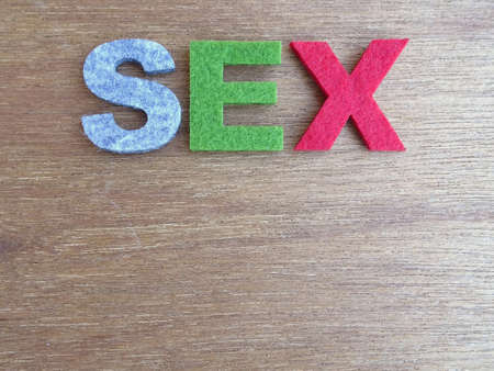 SEX word made from colourful felt fabric isolated on wood texture board.