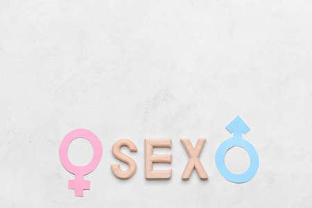 Word SEX with male and female symbols on light background