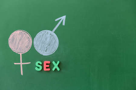 Female and male symbols drawn with written text SEX EDUCATION on chalkboard. Sex education