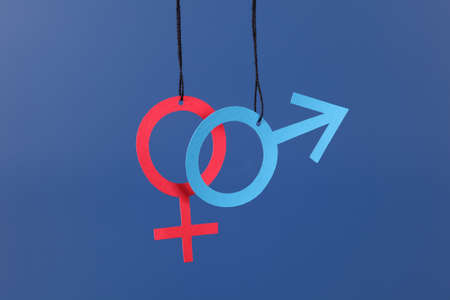 Gender symbols of man and woman of tree on blue background
