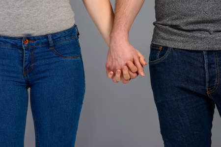Romantic love couple. Relationship concept. Tender friendship, unrecognizable people together holding hands outdoors