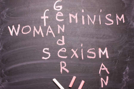Words gender, sexism, feminism written in pink chalk on a chalkboard