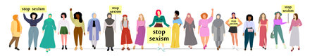 Group of diverse people standing and holding banners or placards in hands with the inscription stop sexism. Prejudice, stereotyping and discrimination. Vector illustration. Not AI generated