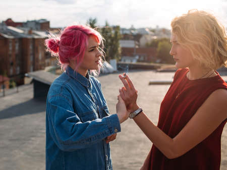 smoking bad habits. Modern teenage addictions. Unhealthy lifestyle. Girl refuses to have a cigarette. Woman with strong convictions