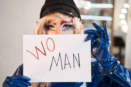Drag queen with vivid makeup hiding his face at shit of paper with word woman